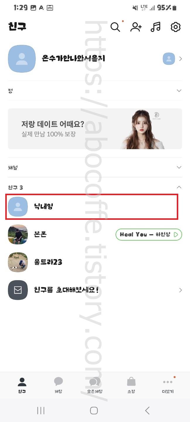 안녕하세요 이번 글에서는 카톡 친구차단방법 차단법에 대하여 간단하게 소개를 해보도록 하겠습니다. 카톡 친구차단방법은 어렵지 않게 진행이 가능하며 차단을 진행하기 위해서는 우선 모바일에서 카톡 앱으로 들어와 좌측 하단에 위치하고 있는 친구 목록 이동 항목을 한번 터치해 다음으로 넘어가 줍니다.