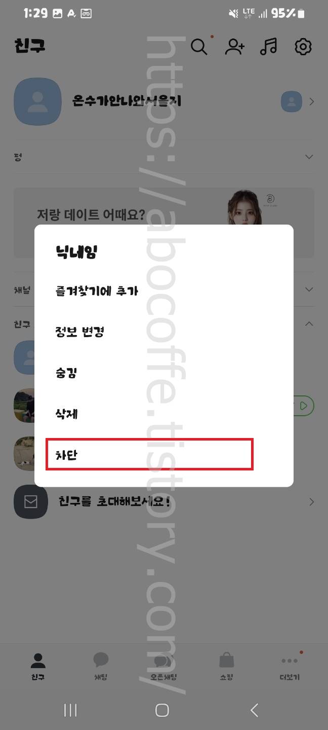 카톡 친구 목록 화면으로 넘어왔다면 여기에서는 차단을 하고자 하는 친구 항목을 꾹 눌러줍니다. 그럼 위와 같이 팝업창이 하나 뜨는데요. 여기에서 차단 항목을 한번 터치해 선택합니다.