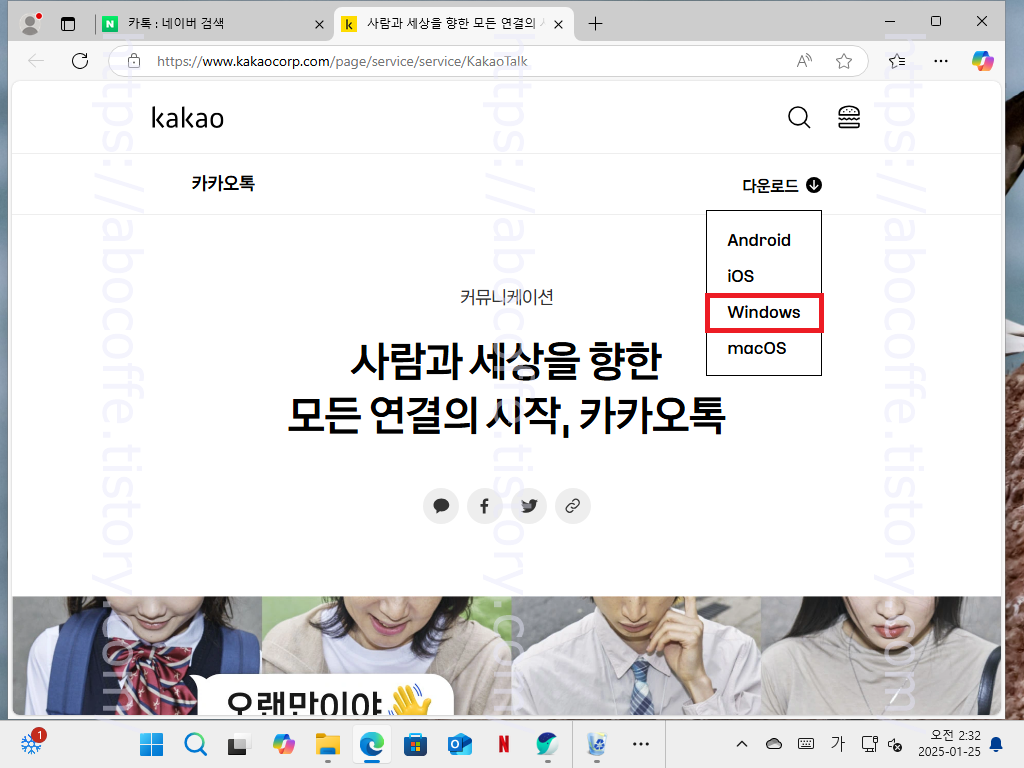 카톡 홈페이지로 넘어왔다면 여기에서는 오른쪽 상단에 위치하고 있는 다운로드 버튼을 눌러줍니다.