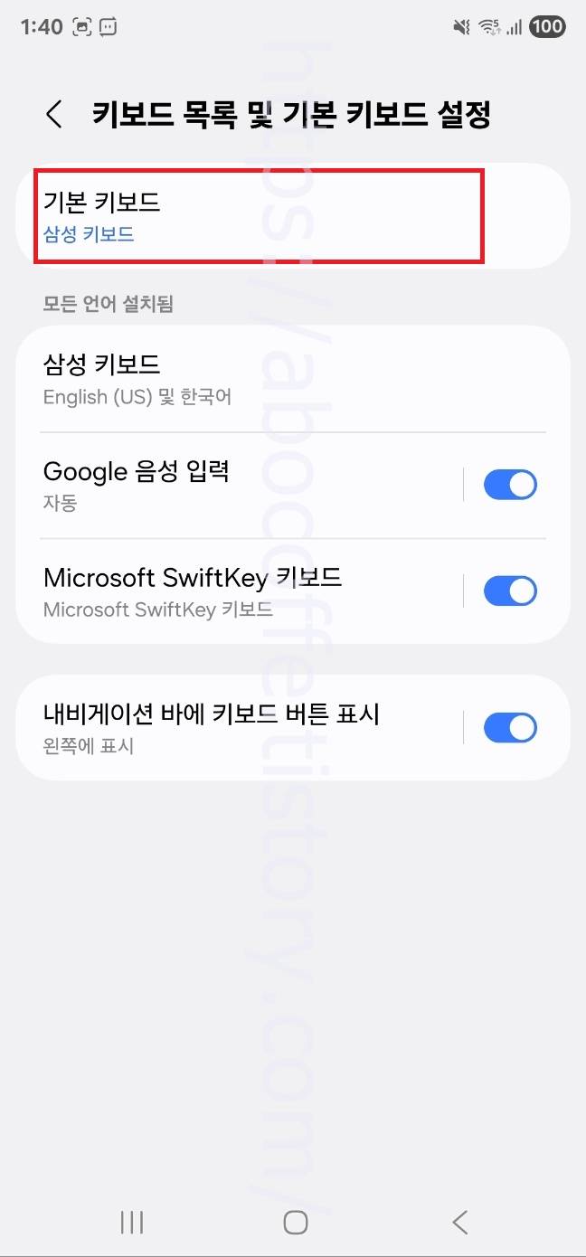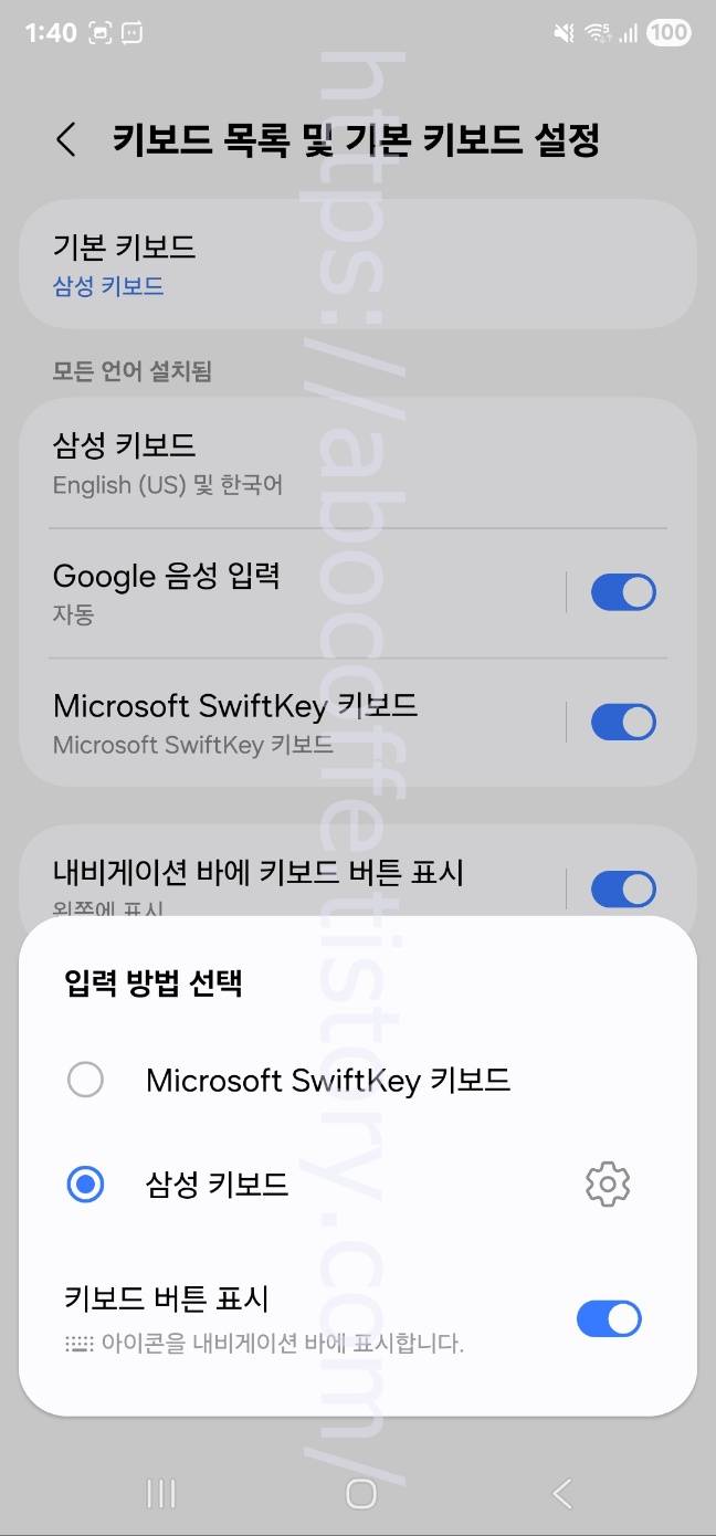 키보드 목록 및 기본 키보드 설정 페이지로 넘어오면 여기에서는 상단 기본 키보드 항목을 선택하고 아래쪽에 입력 방법 선택 팝업창이 뜨면 기본 키보드로 사용할 키보드 항목을 선택합니다.