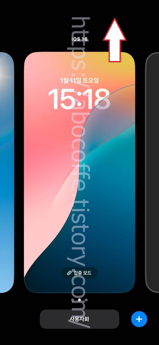 페이스 아이디 인증을 진행하면 위와 같이 편집 모드 화면으로 전환이 되며 여기에서 삭제를 진행하고자 하는 배경화면 항목으로 이동을 합니다. 그리고 해당 배경화면 항목을 아래에서 위로 가볍게 쓸어올려 줍니다.