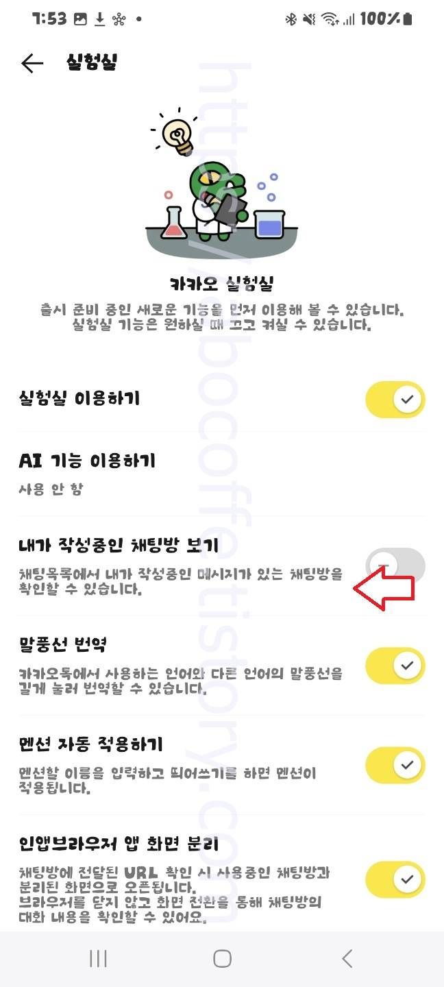 실험실 페이지로 넘어오면 여러 가지 항목들이 보여지며 여기에서는 내가 작성 중인 채팅방 보기 기능을 활성화에서 비호라성화로 전환해주면 됩니다. 해당 기능을 끄면 채팅목록에서 내가 작성중인 메시지가 있는 채팅방을 확인하지 않아도 됩니다. 그럼 여기까지 포스팅을 마치며 카톡 채팅방 회색 말풍선 표시 끄기 내가 작성중인 채팅방 보기 기능 해제 방법에 대하여 간단하게 알아보는 시간이었습니다.