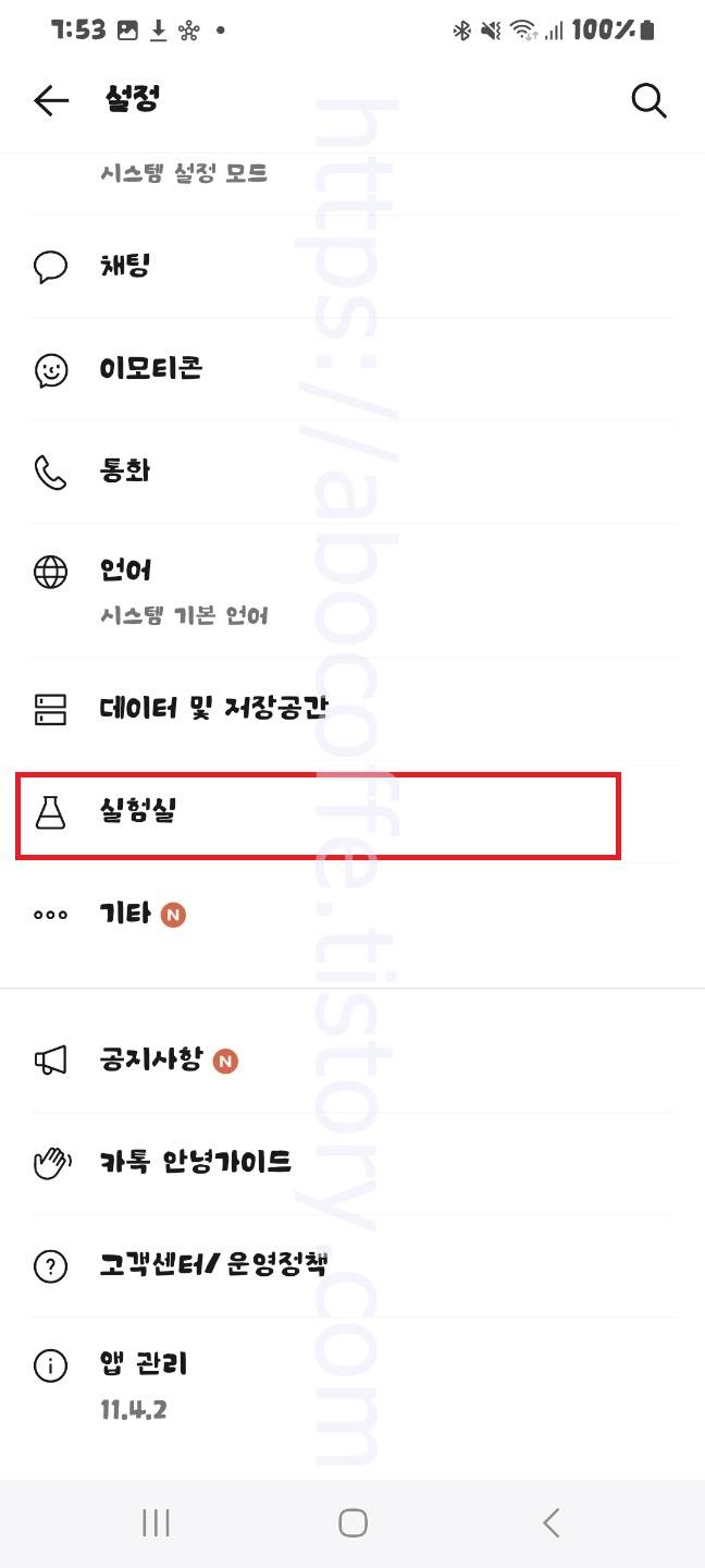 카톡 전체설정 앱 페이지로 넘어왔다면 여기에서는 스크롤을 아래쪽으로 천천히 내려 하단쯤에 위치하고 있는 실험실 항목을 한번 터치해 들어가 줍니다.