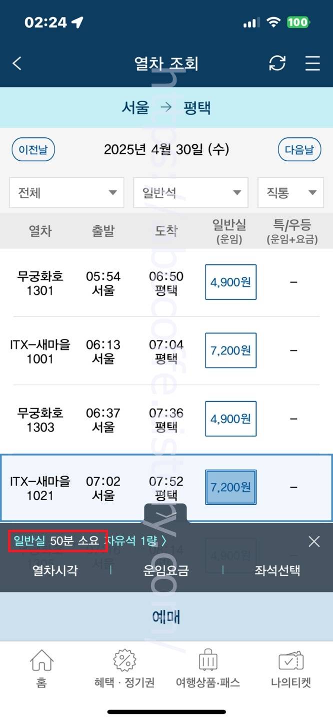 곧바로 해당 날짜에 대한 서울에서 평택으로 가는 기차 첫차부터 막차까지 조회가 진행되며 요금도 함께 확인을 해볼 수 있습니다.