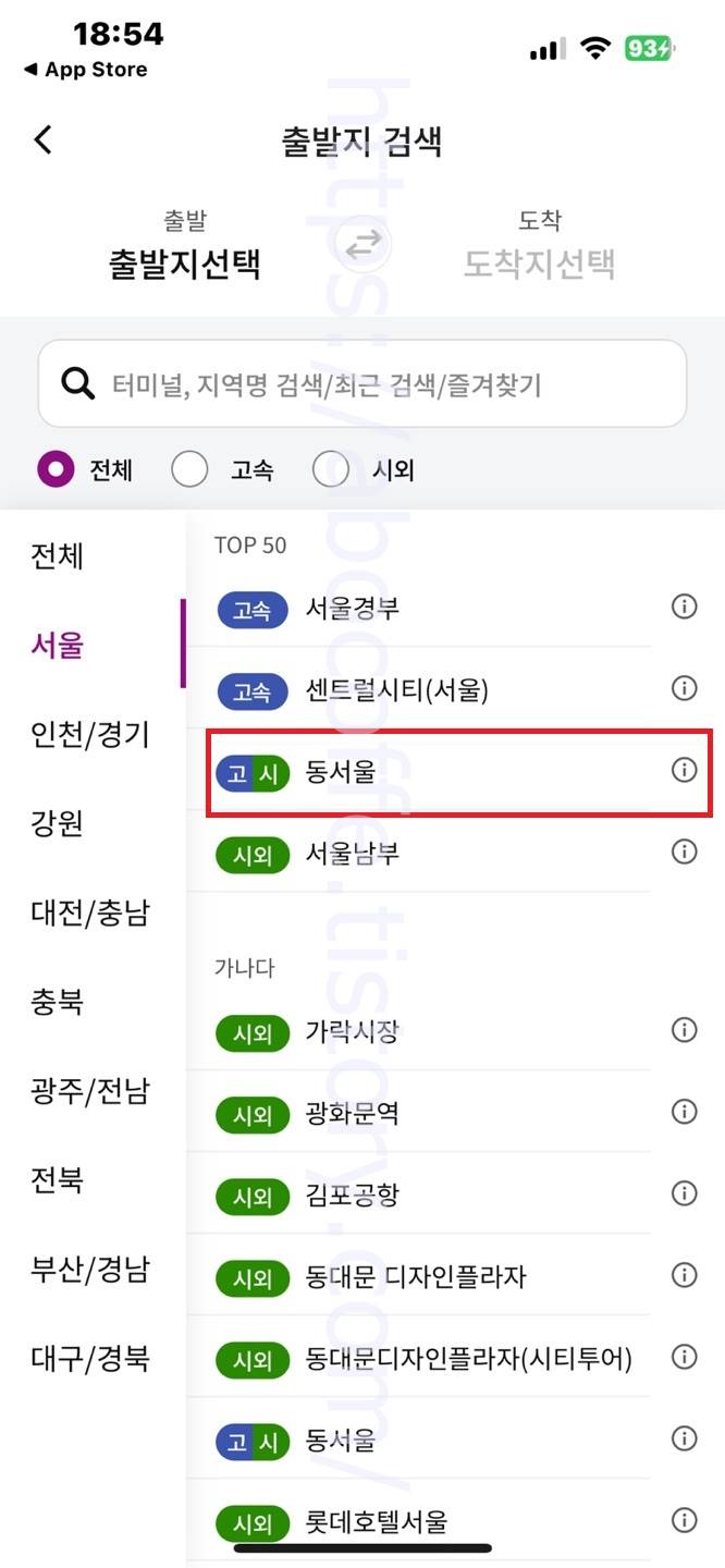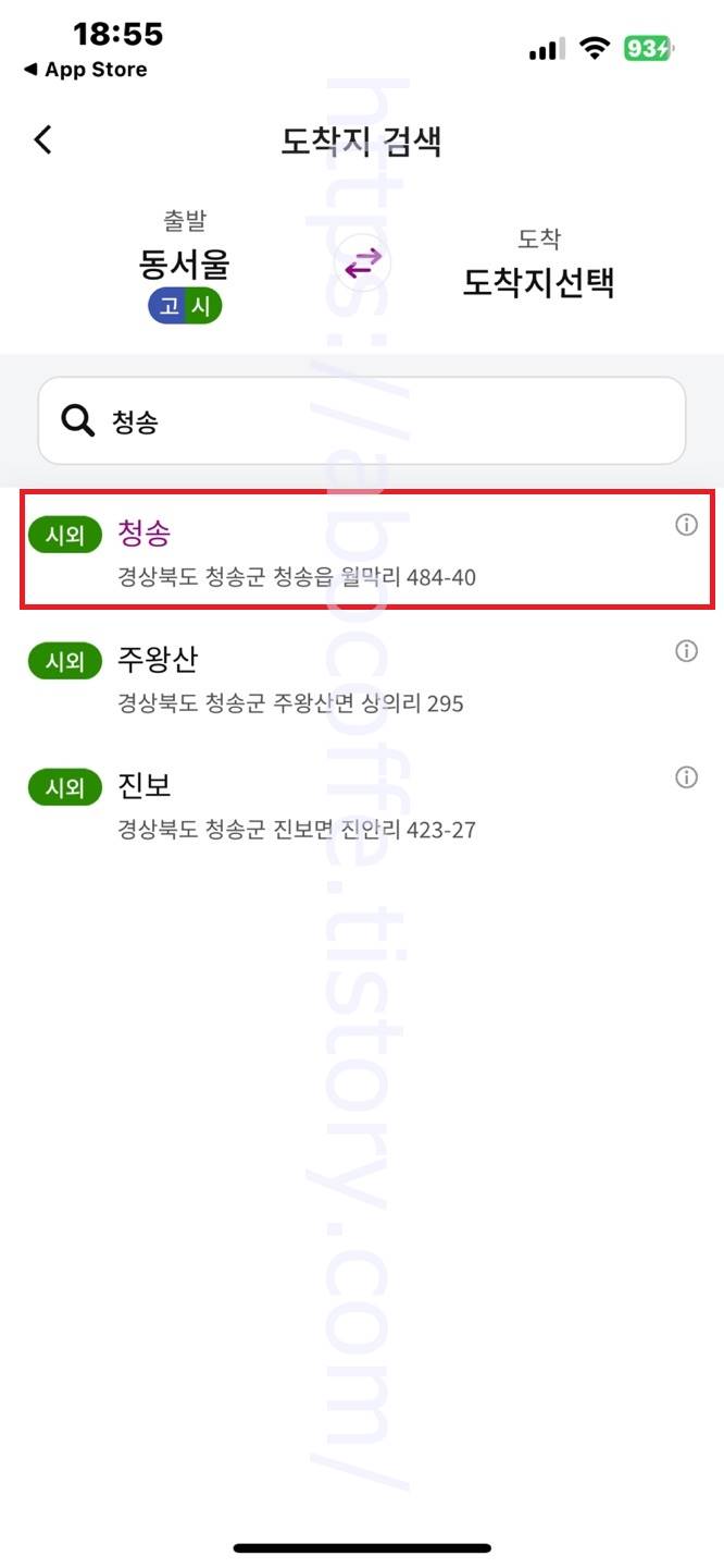 출발지 검색 화면으로 넘어오면 서울 목록에서 동서울터미널을 선택합니다. 그리고 도착지 검색 화면으로 넘어오면 청송 검색 후에 이용할 터미널 또는 정류소를 선택합니다.