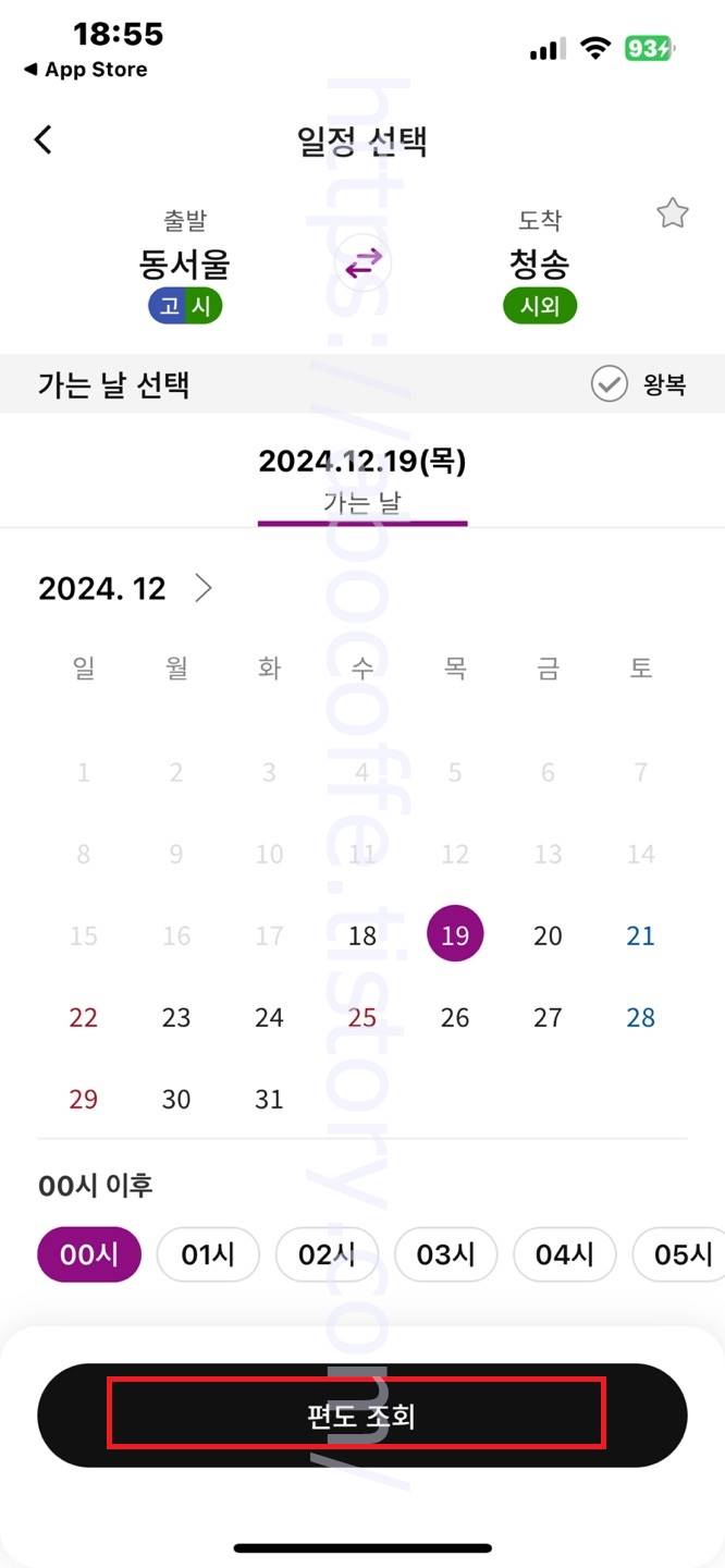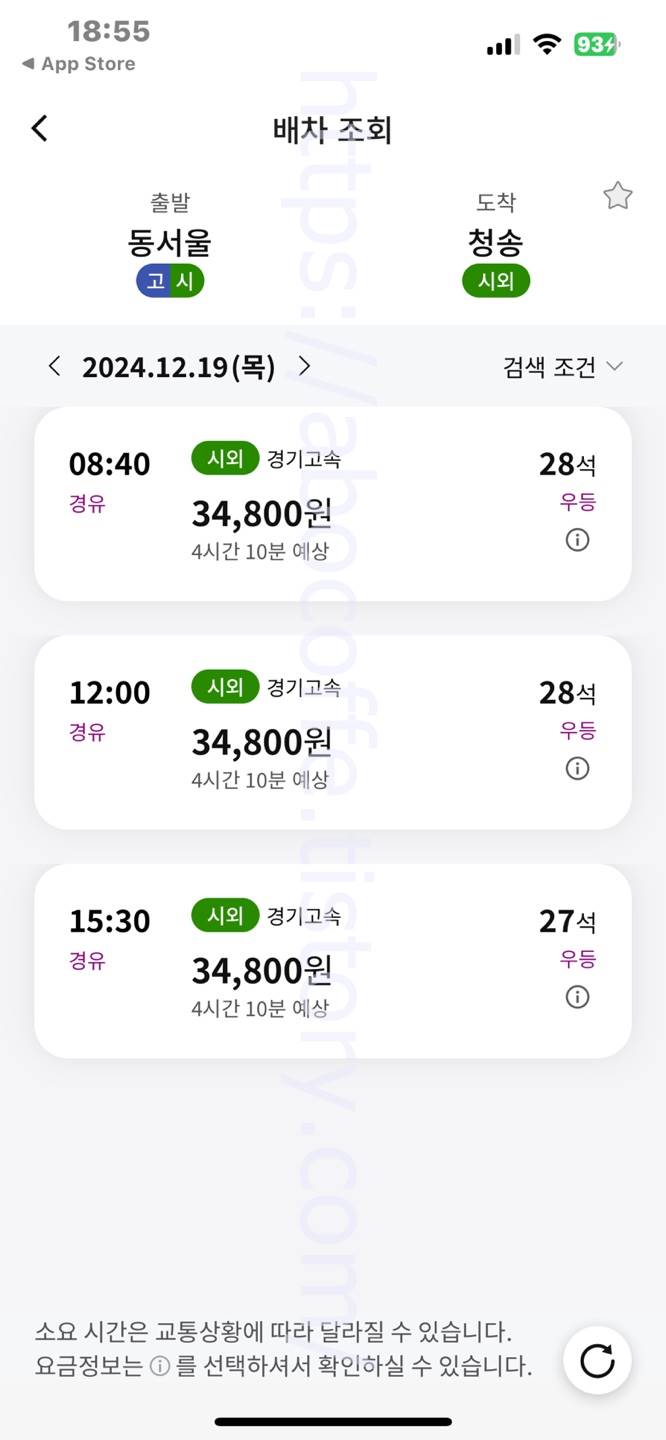 출발지 및 도착지 선택 후에 일정 선택 화면으로 넘어오면 시외버스 이용 날짜를 선택하고 하단 조회 버튼을 눌러줍니다. 곧바로 배차 조회 화면으로 넘어오며 해당 날짜에 대한 시외버스 첫차부터 막차까지 시간표 확인이 가능하고 소요시간, 운임요금, 버스등급, 잔여좌석 확인이 가능합니다. 그럼 여기까지 포스팅을 마치며 동서울에서 청송 가는 시외 버스 시간표 요금표 소요시간 운임요금에 대하여 간단하게 알아보는 시간이었습니다.
