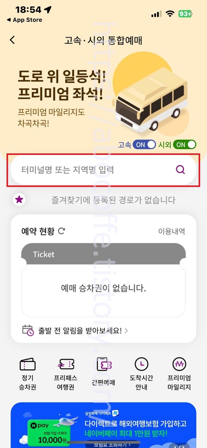 티머니고 앱 페이지로 넘어오면 홈 화면에서 고속/시외 버튼을 눌러 들어갑니다. 그리고 터미널명 또는 지역명 입력 버튼을 눌러 들어가 줍니다.
